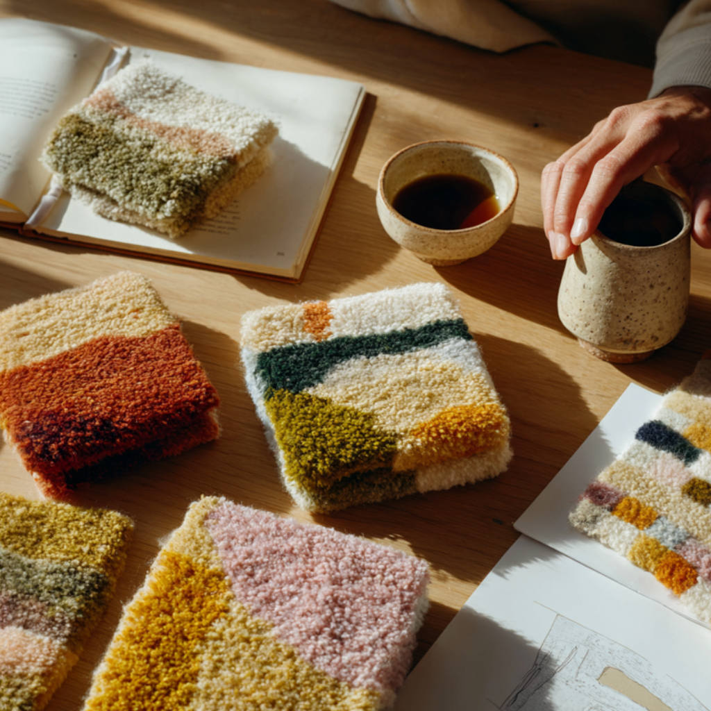 Chaque création débute par la sélection des matières et des proportions idéales. Nous vous guidons sur le choix de la laine, la densité du tissage et les dimensions adaptées à votre espace.