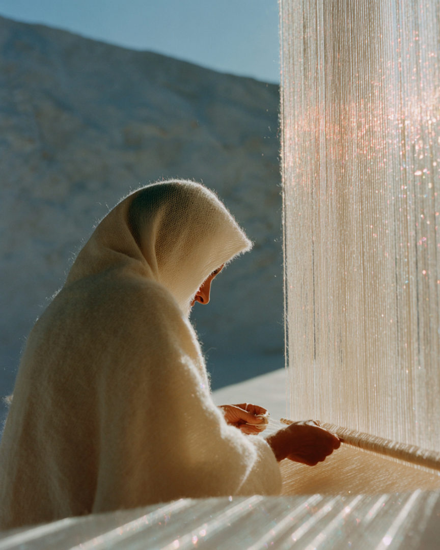 Chaque pièce est ensuite tissée à la main par nos artisanes selon les techniques traditionnelles. La fabrication respecte un rythme patient et exigeant, garantissant la qualité de la matière, la finesse du geste et la fidélité du rendu jusqu’à la livraison finale.